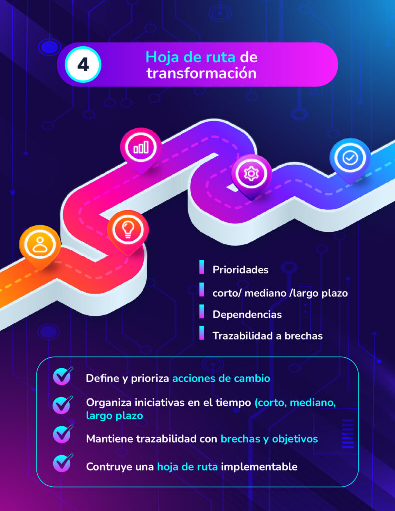 Salida: hoja de ruta de transformación, trazable al AS-IS, al TO-BE y a las brechas identificadas.
